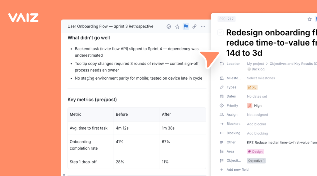 In Vaiz, tasks and documents exist in the same workspace and can be opened side by side in a single window. When you are working through a RAID log entry and need to reference the project brief, you do not switch tabs. When you are reviewing a sprint task and the spec doc needs to be updated, you update it in the same view. The cognitive overhead of maintaining context across multiple tools disappears.