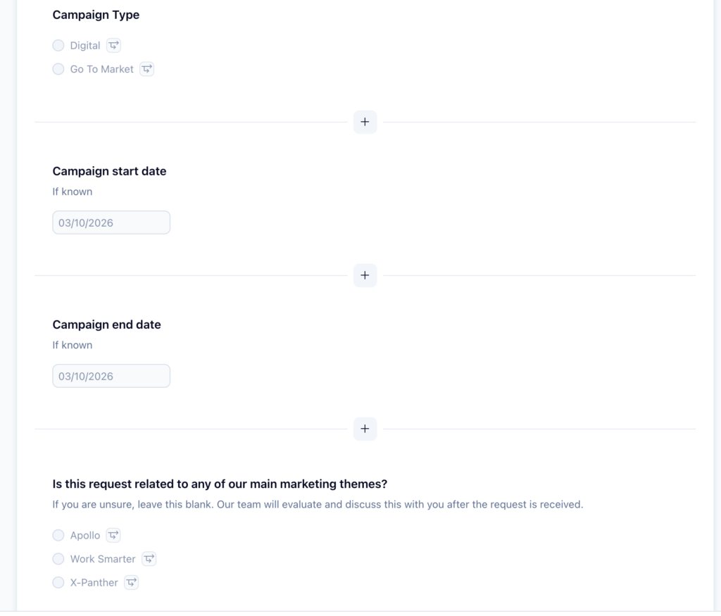 Use Wrike request forms as the standard intake channel so all campaign requests are submitted in one place. Forms can automatically create tasks or projects and can also be shared with external users via a link.