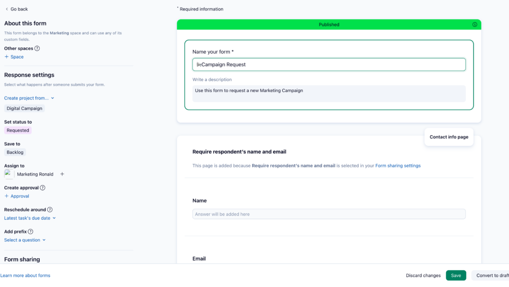 Request forms can be configured to automatically create tasks or projects and route them to the correct workspace or team. They can also be shared externally so stakeholders or clients can submit campaign requests through a simple link.