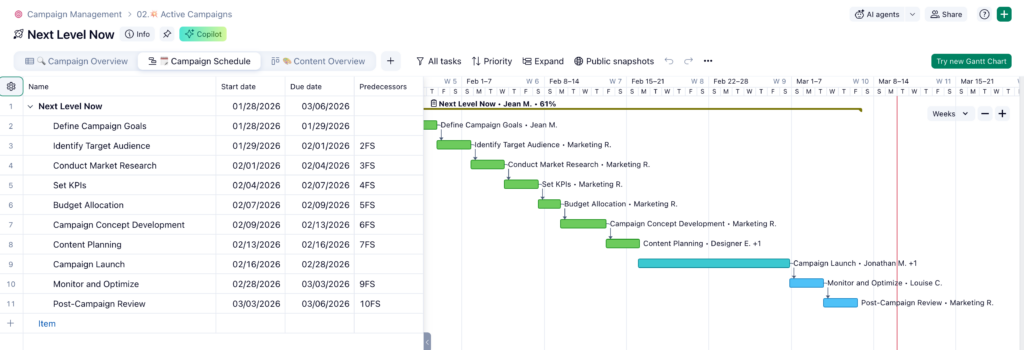 Use task dependencies in the Gantt chart so when a task moves, dependent tasks automatically adjust. This keeps campaign timelines aligned.