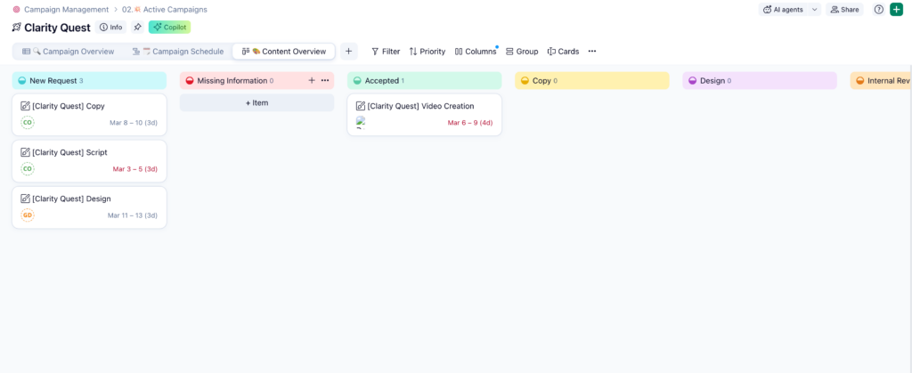 Once campaigns enter the system, tasks should move through a defined workflow that mirrors how work actually progresses. Marketing teams often use stages such as Intake, In Production, In Review, Approved, Scheduled, Live, and Complete.