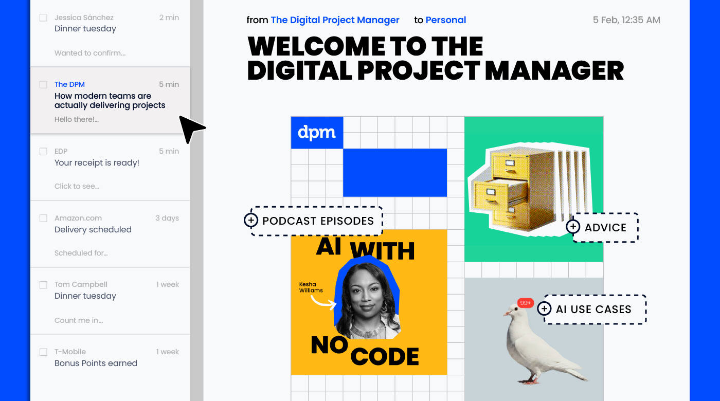 The DPM Newsletter is one of the largest project management newsletters, trusted by PMs and delivery leaders navigating real-world complexity. Twice a week, DPM breaks down how modern teams are actually delivering projects—what tools they use, where AI helps, and what to do when things go sideways. No theory. Just proven guidance you can use on your next project.
