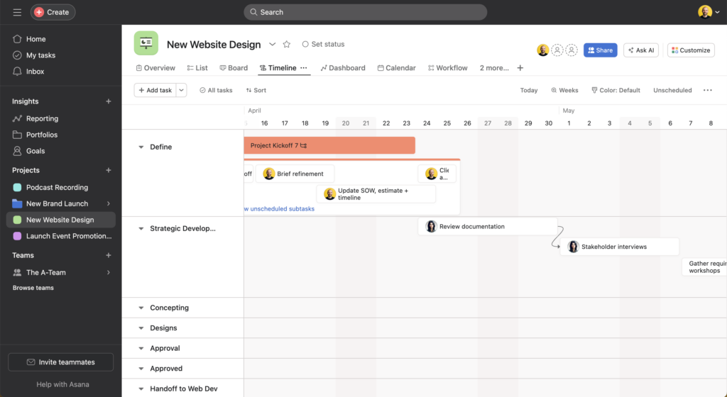 You've successfully set up project management in Asana when your project contains all necessary tasks with clear owners and due dates, dependencies reflect the actual work sequence, and team members can see what they're responsible for. Your timeline view shows a realistic schedule with minimal conflicts, and stakeholders receive regular status updates via the project feed. Tasks move through your workflow stages as work progresses, and you can answer "what's the status?" questions by looking at the project rather than chasing people for updates.