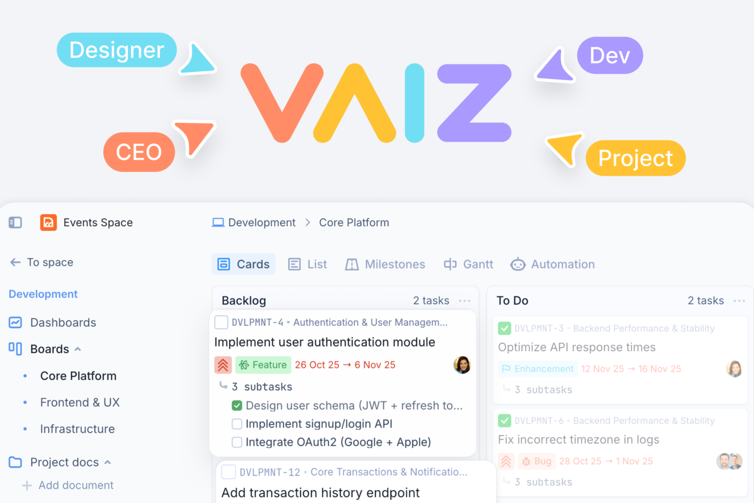 Vaiz is a strong fit if you want to bring tasks and documentation into one connected workspace without juggling multiple tools. It works best for cross-functional teams—like product, engineering, marketing, or operations—that need structured workflows, dependencies, and built-in context, but don’t rely heavily on a large ecosystem of native integrations. If you value a unified system with automation, AI assistance, and flexibility (and can tolerate some learning curve), Vaiz will likely suit your needs.